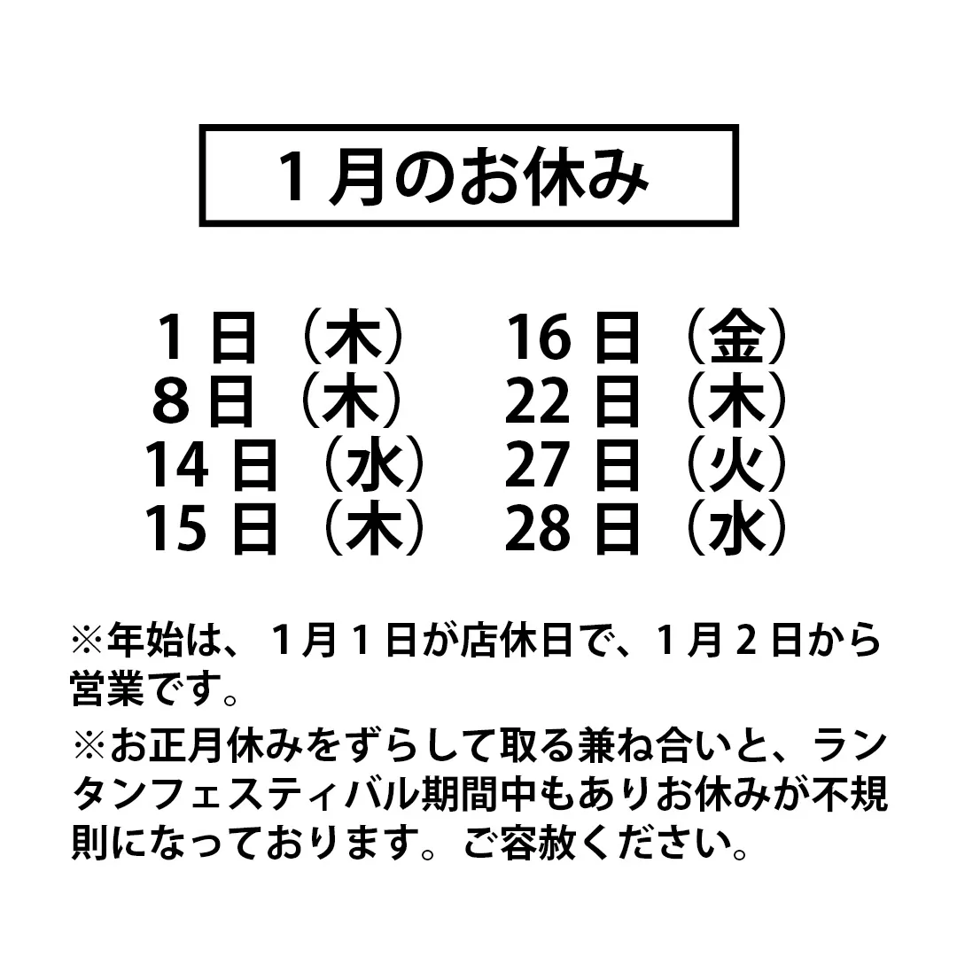 また、お正月休みをずらして取る兼ね合いと来月ランタンフェスティバル期間中の日程調整もあり お休みが不規則になっております。ご容赦ください。