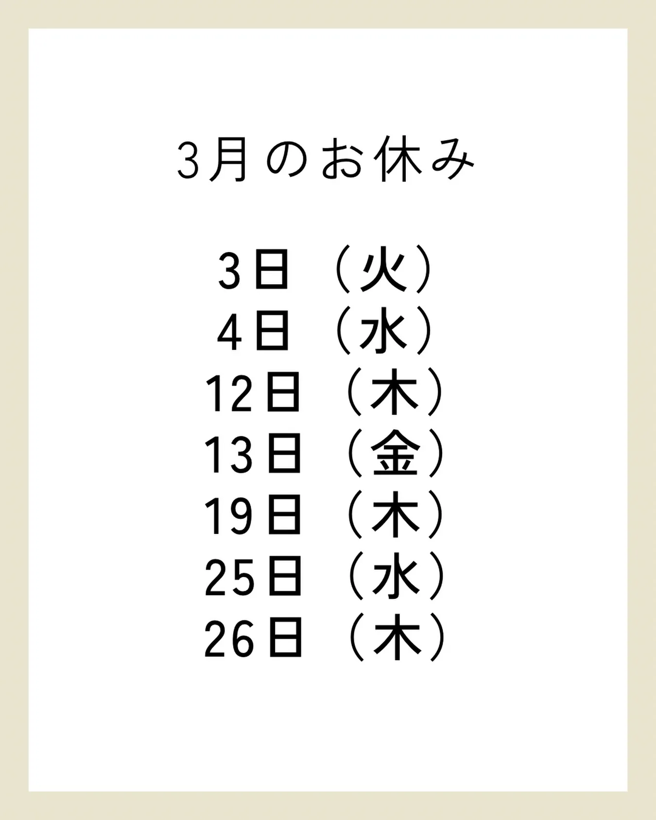 3月のお休みのお知らせです🙌✨ 来月もよろしくお願いします🙇